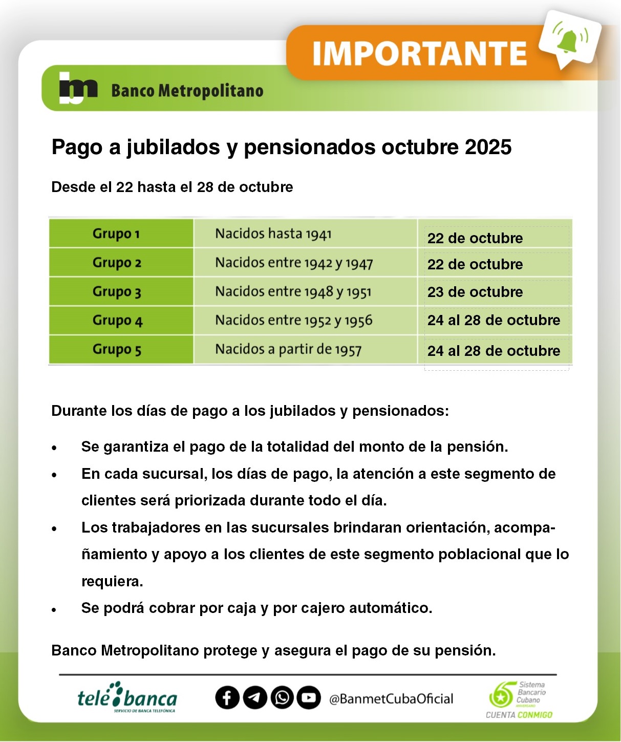 Adelanto del pago a jubilados y pensionados en La Habana mes de octubre 2025. Puede cobrar, si lo desea, hasta el día 28 de octubre, según el calendario oficial.