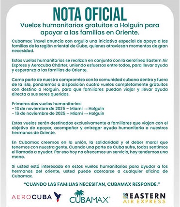 Dos vuelos humanitarios desde la ciudad de Miami con destino a Holguín para beneficio de los afectados por el huracán Melissa fueron anunciados este miércoles en la página de Facebook de la agencia de viajes Cubamax Travel.