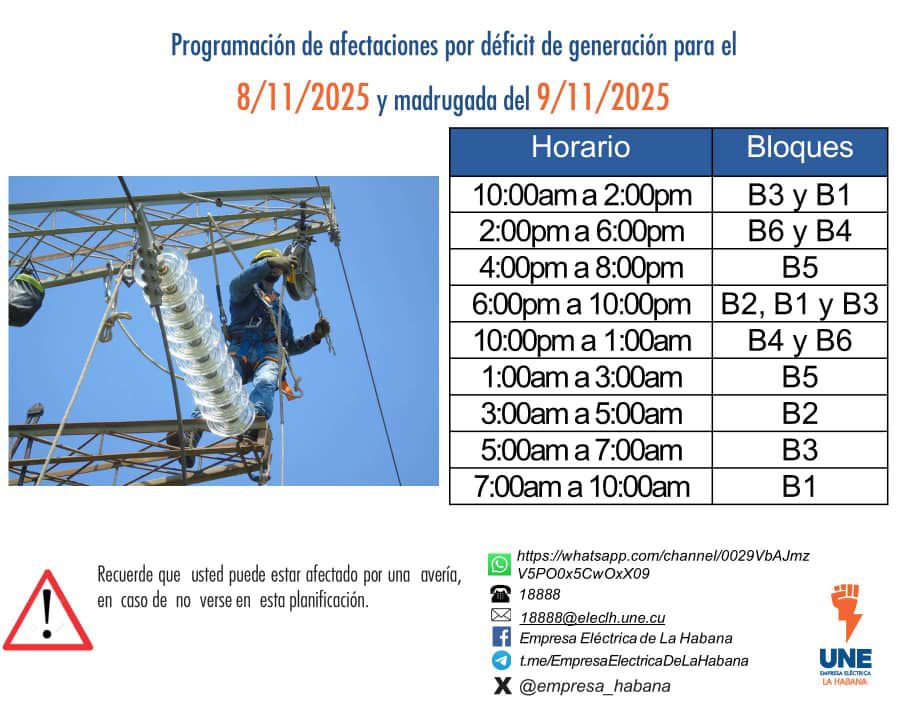 A través de sus perfiles institucionales en las distintas redes sociales digitales, la Empresa Eléctrica de La Habana (EELH) emitió una nota informativa en la que comunica a la población que en el día de ayer se afectó el servicio en la capital 14:00 horas, siendo el pico máximo de 150 MW a las 7:00 p.m. y quedando restablecido a las 12:43 a.m. En la madrugada a partir de las 2:40AM hubo afectación por déficit, se restableció a las 7:10AM.