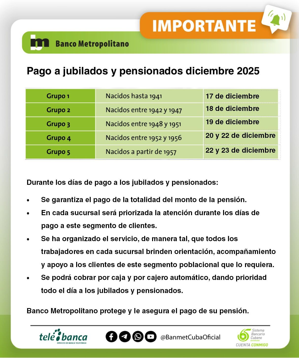 A través de su perfil en Facebook el Banco Metropolitano s.a. (Banmet) anuncia a la población un adelanto en el pago a los jubilados y pensionados de La Habana en diciembre de 2025.