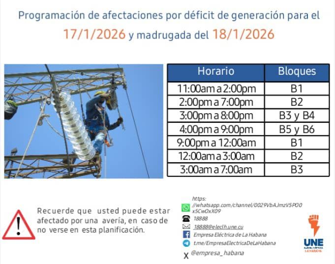 A través de sus perfiles institucionales en las distintas redes sociales digitales, la Empresa Eléctrica de La Habana (EELH) emitió una nota informativa en la que comunica a la población que en el día de ayer se afectó el servicio en la capital 14:39 horas, siendo el pico máximo de 388 MW a las 6:20 p.m., quedando restablecido a las 09:06 p.m.