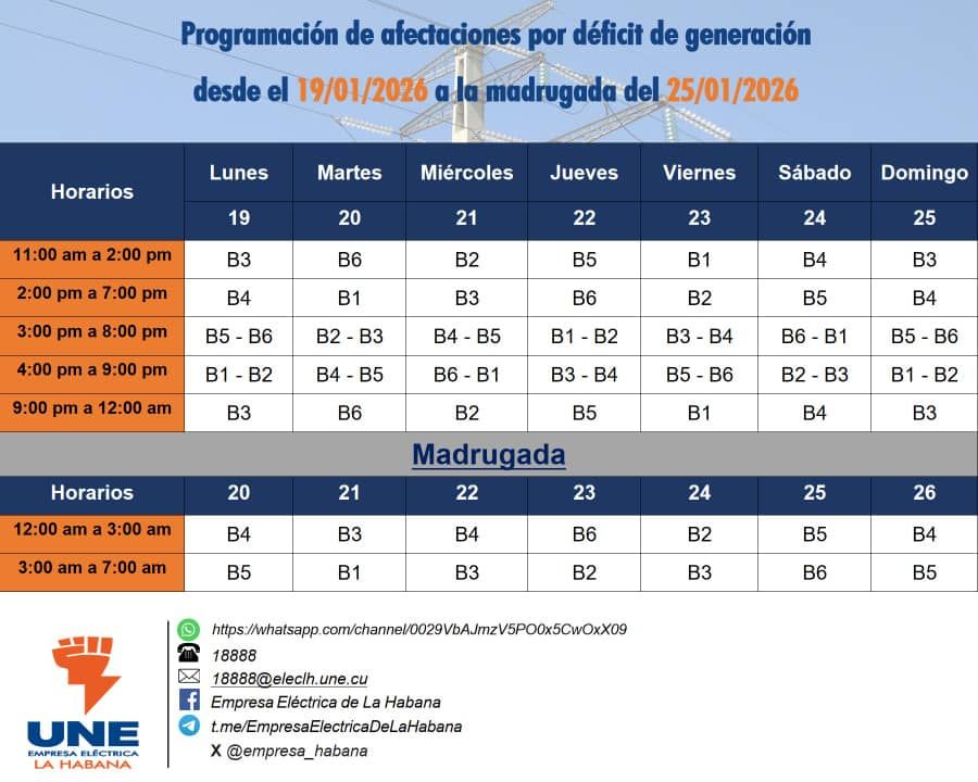 A través de sus perfiles institucionales en las distintas redes sociales digitales, la Empresa Eléctrica de La Habana (EELH) informa a sus clientes la siguiente planificación de afectaciones al servicio en la semana del 19 al 25 de enero de 2026: