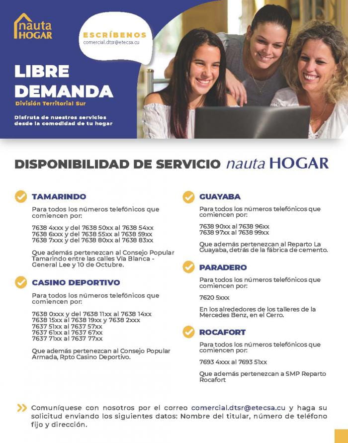 ETECSA informa de los lugares de Libre Demanda de Servicio Nauta Hogar; si usted pertenece a algunas de esas zonas y está interesado puede escribir al correo siguientes:comercial.dtsr@etecsa.cu.