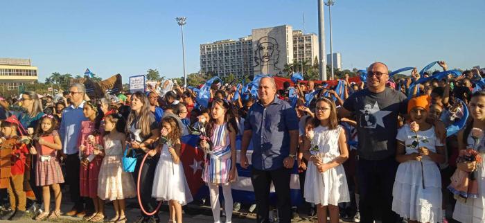 Con sus uniformes escolares, trajes que representan los cuentos de la Edad de Oro, esa revista que escribió el Apóstol para los niños de América, con rosas blancas en sus manos entre otras iniciativas, los niños pasaron bajo la inmensa estatua que recrea la imagen del más universal de los cubanos.