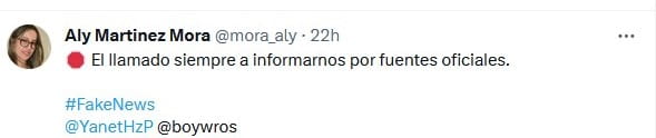 A través de su cuenta en X (antes Twitter) la Gobernmadora de La Habana, Yanet Hernández Pérez, demintió una noticia falsa que circula en las Redes Sociales Digitales relacionada de una protesta en el municipio de Boyeros por falta de agua y luz.