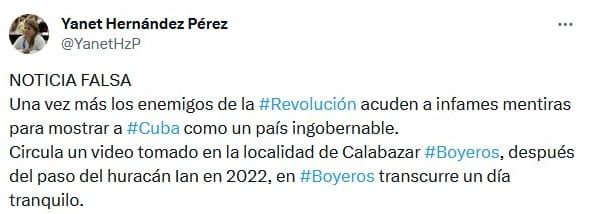 "NOTICIA FALSA: Una vez más los enemigos de la Revolución acuden a infames mentiras para mostrar a Cuba como un país ingobernable. Circula un video tomado en la localidad de Calabazar, Boyeros, después del paso del huracán Ian en 2022, en Boyeros transcurre un día tranquilo", publicó Yanet.