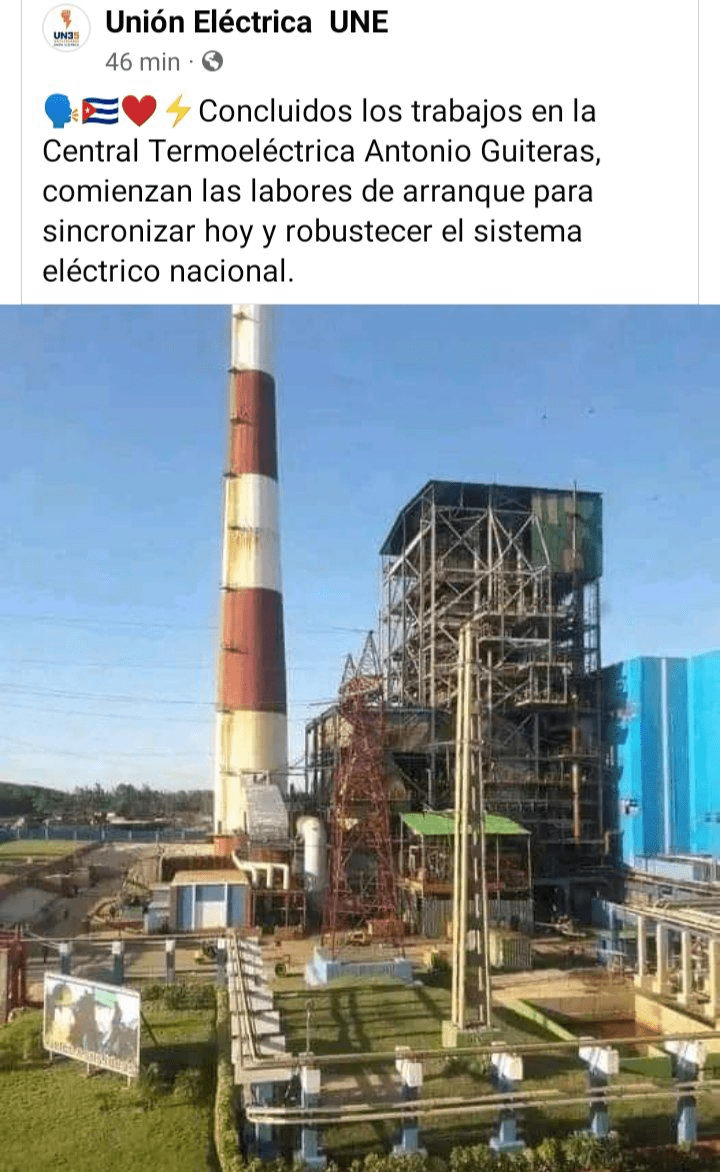 A las 12:00 pm se anunciaba la conclusión de los trabajos de en la Central Termoeléctrica Antonio Guiteras, comenzando a esa hora la fase de arranque para luego sincronizarla al SEN