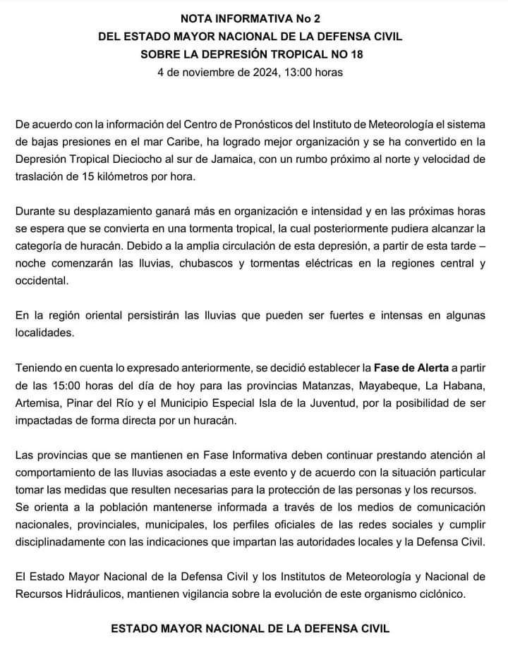 La Defensa Civil advirtió que durante su desplazamiento ganará más en organización e intensidad y en las próximas horas se espera que se convierta en una tormenta tropical, la cual posteriormente pudiera alcanzar la categoría de huracán.