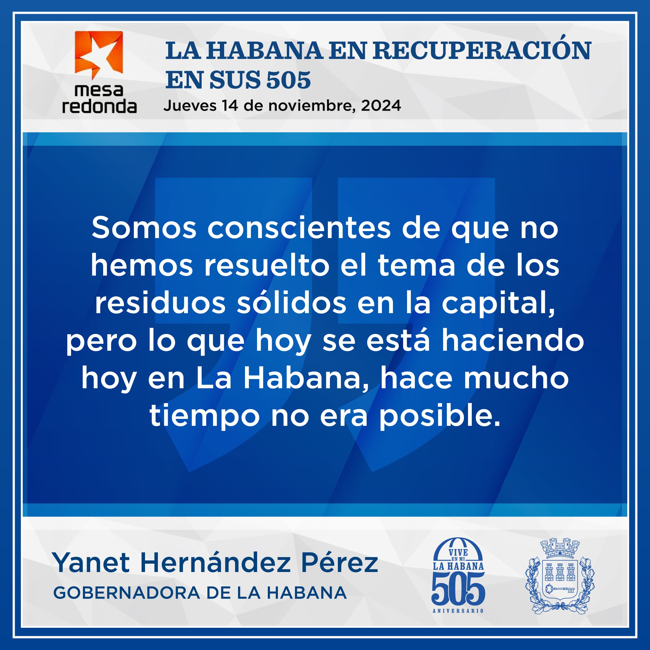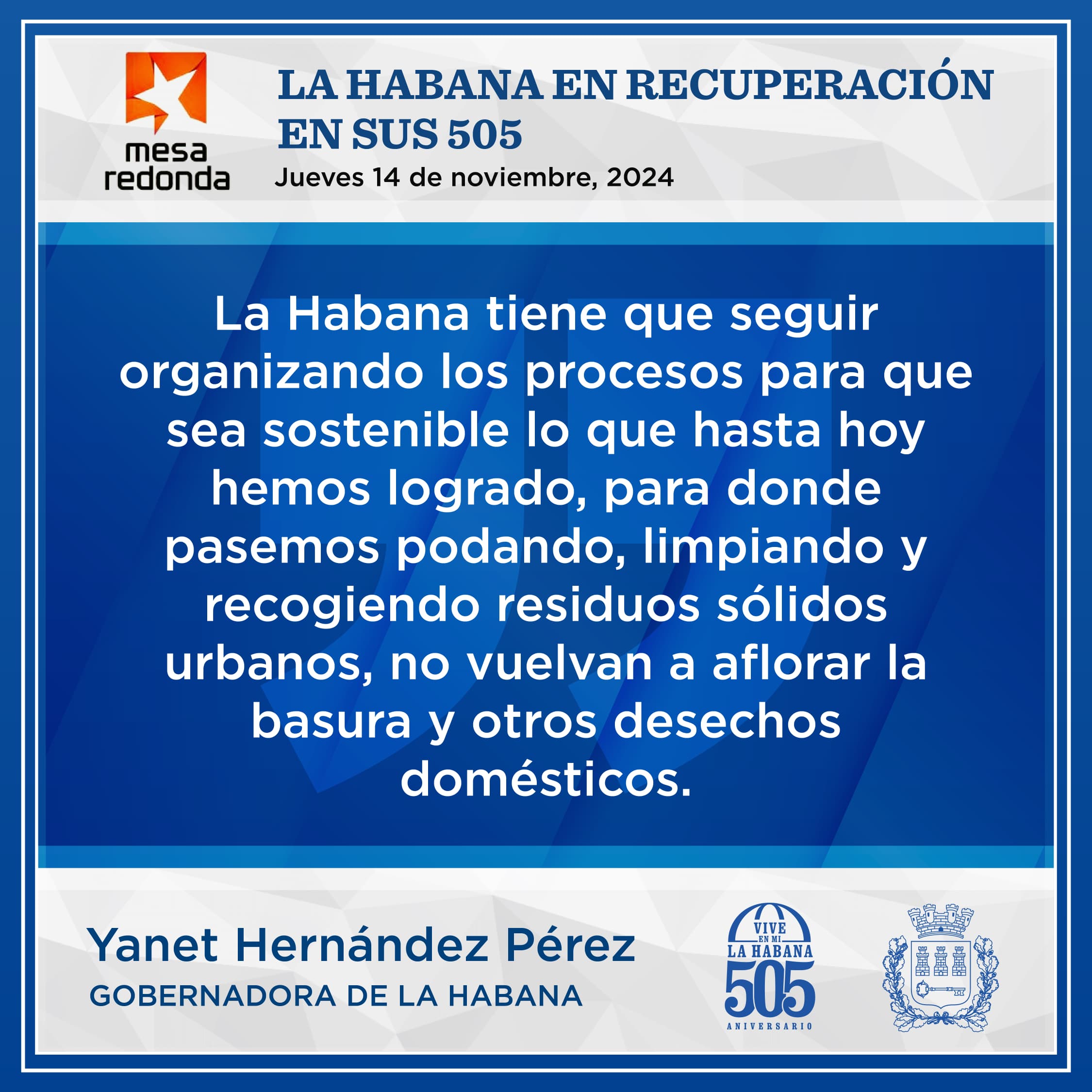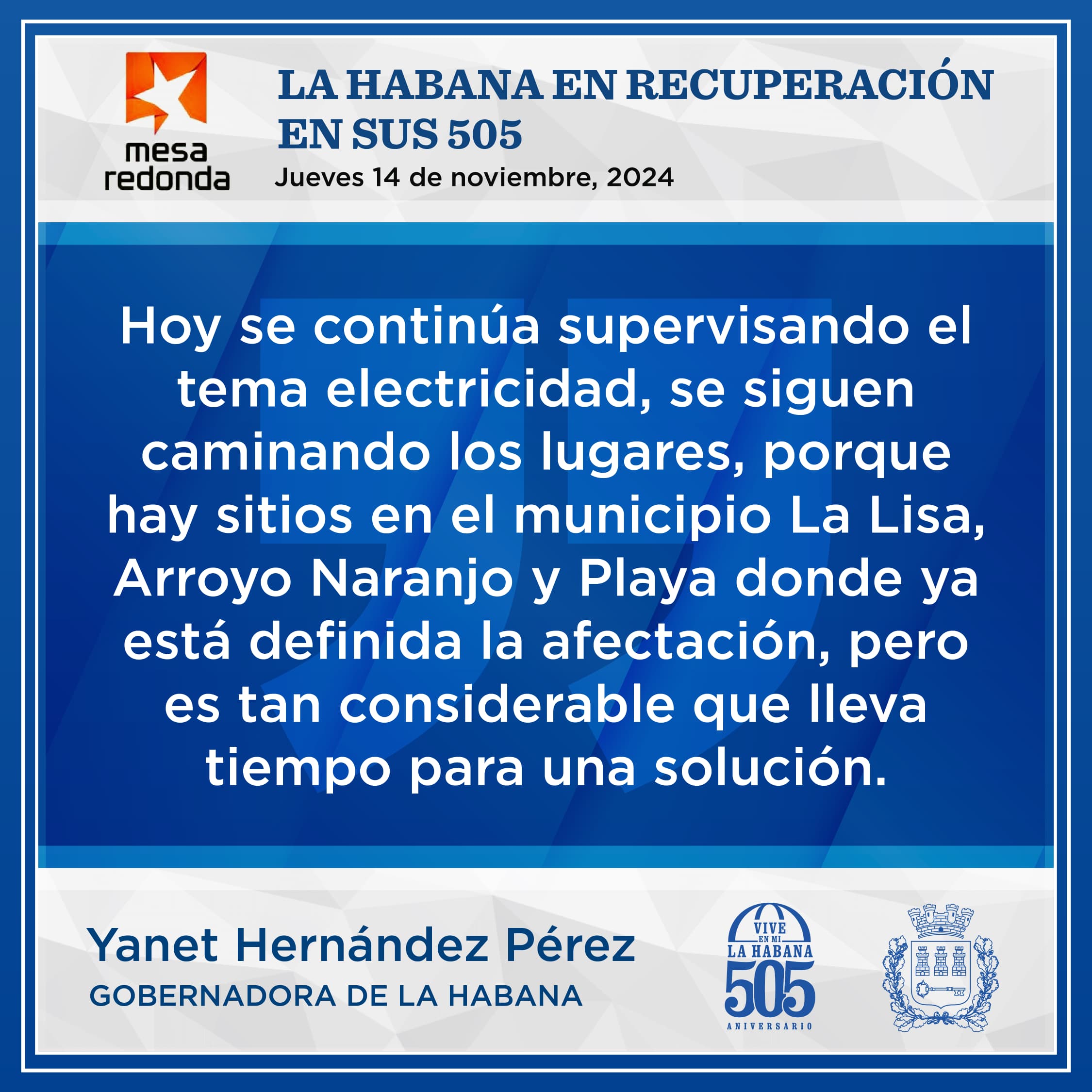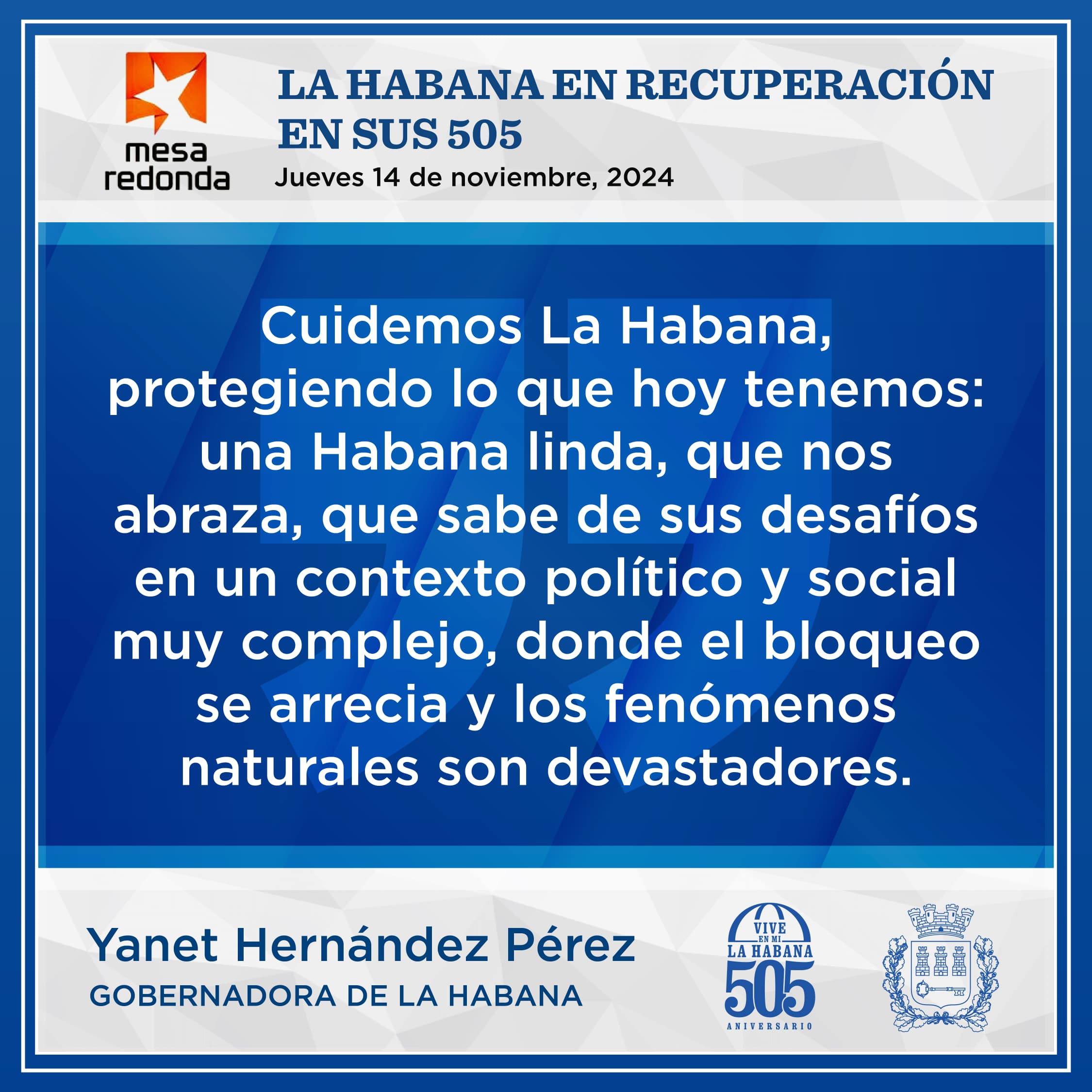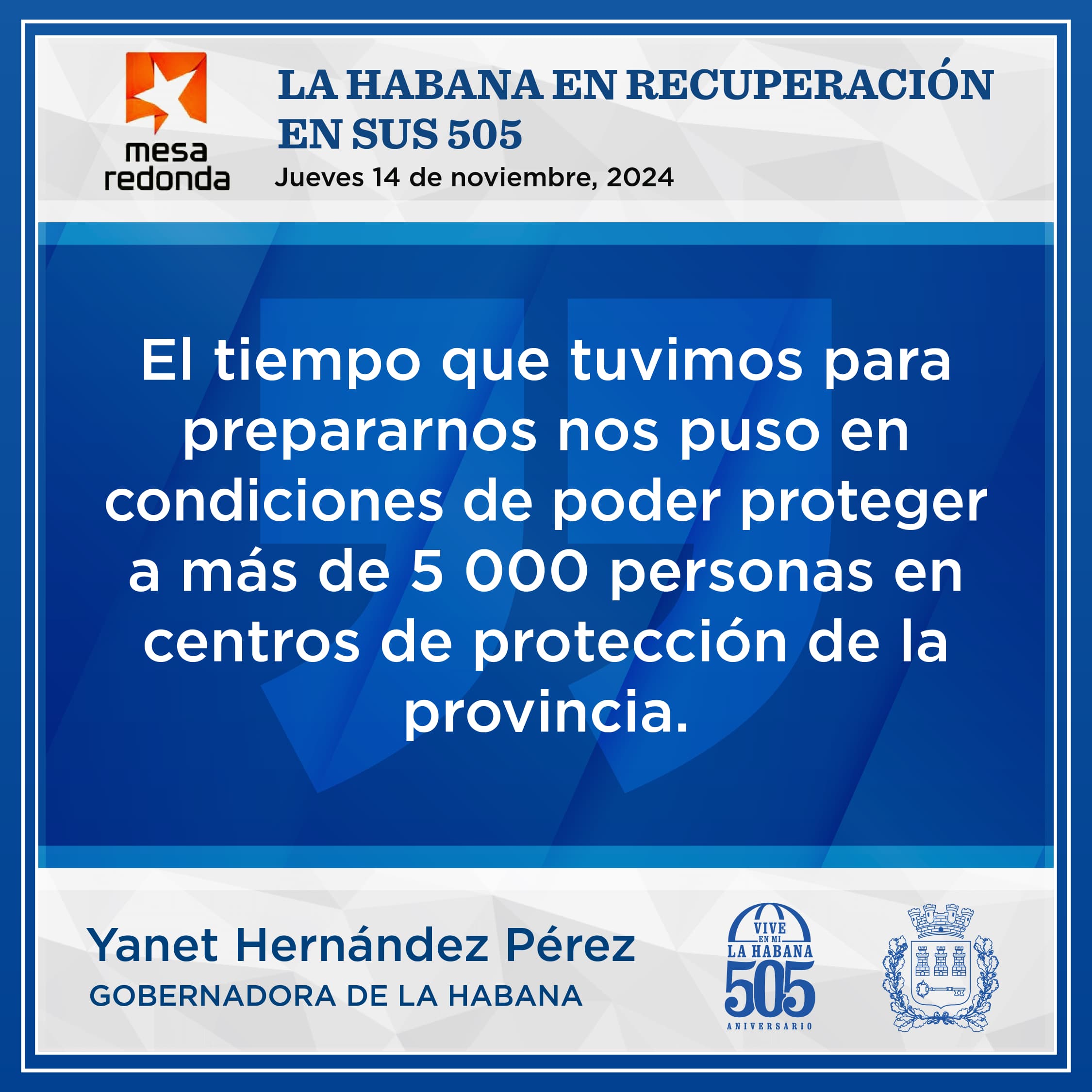 La Gobernadora de La Habana Yanet Hernández Pérez compareció este jueves en el programa Mesa Redonda, junto a otros directivos, para informar detalles sobre las labores de recuperación en la capital tras el paso del huracán Rafael y a pocas horas de celebrar el aniversario 505 de la fundación de la Villa de San Cristóbal de La Habana.