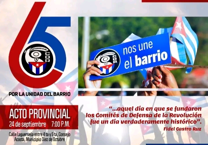 El Acto Provincial por el aniversario 65 de la fundación de los Comités de Defensa de la Revolución (CDR) en La Habana, convocado para el 24 de septiembre de 2025 a las 7:00 p.m., se realizará en el municipio de Diez de Octubre, reconocido como Vanguardia Nacional en las tareas de la organización.