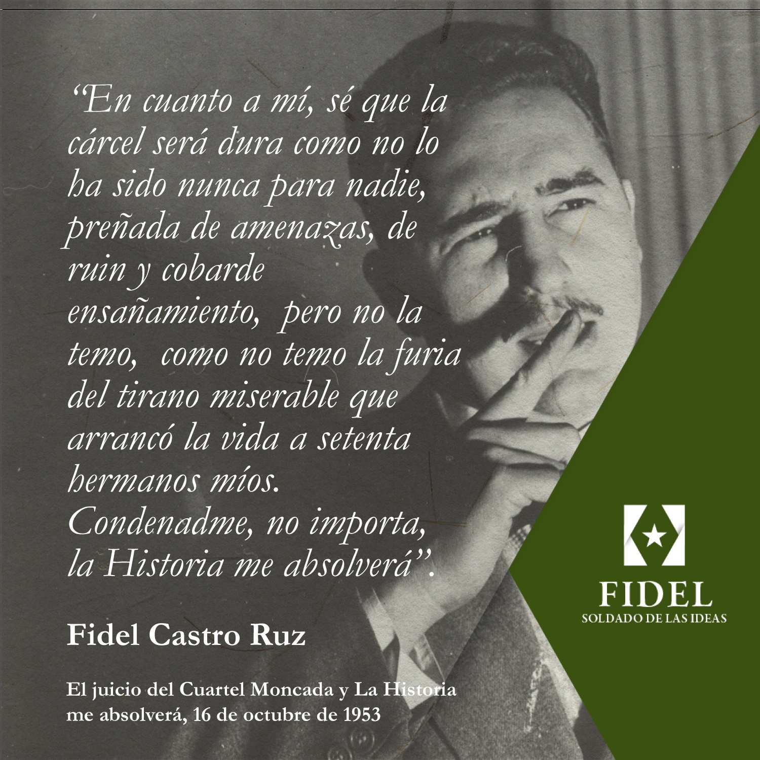 El 16 de octubre de 1953 en condiciones extremadamente difíciles, ya que estaba prácticamente aislado, rodeado de soldados, Fidel Castro expuso su alegato calificado después como la Historia me absolverá, en el juicio que se le reanudó por haber organizado y dirigido los asaltos a los cuarteles Moncada, en Santiago de Cuba y el Carlos Manuel de Céspedes, en Bayamo.