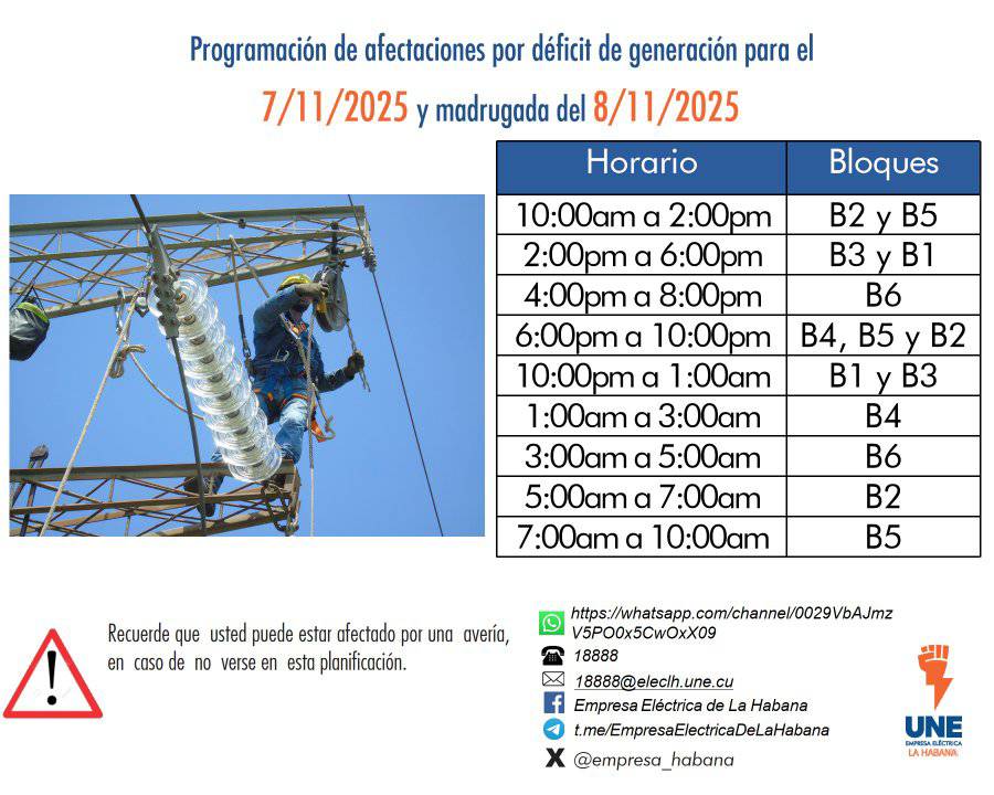 A través de sus perfiles institucionales en las distintas redes sociales digitales, la Empresa Eléctrica de La Habana (EELH) emitió una nota informativa en la que comunica a la población que en el día de ayer se afectó el servicio en la capital 9:54 horas, siendo el pico máximo de 157 MW a las 6:30 p.m. y quedando restablecido en el lapso de una hora y 50 minutos, No fue necesario afectar los bloques planificados (2 y 5) a las 10:00PM. Sin embargo si lo fue para el bloque 4 entre las 6:00 y las 7:00 a.m.