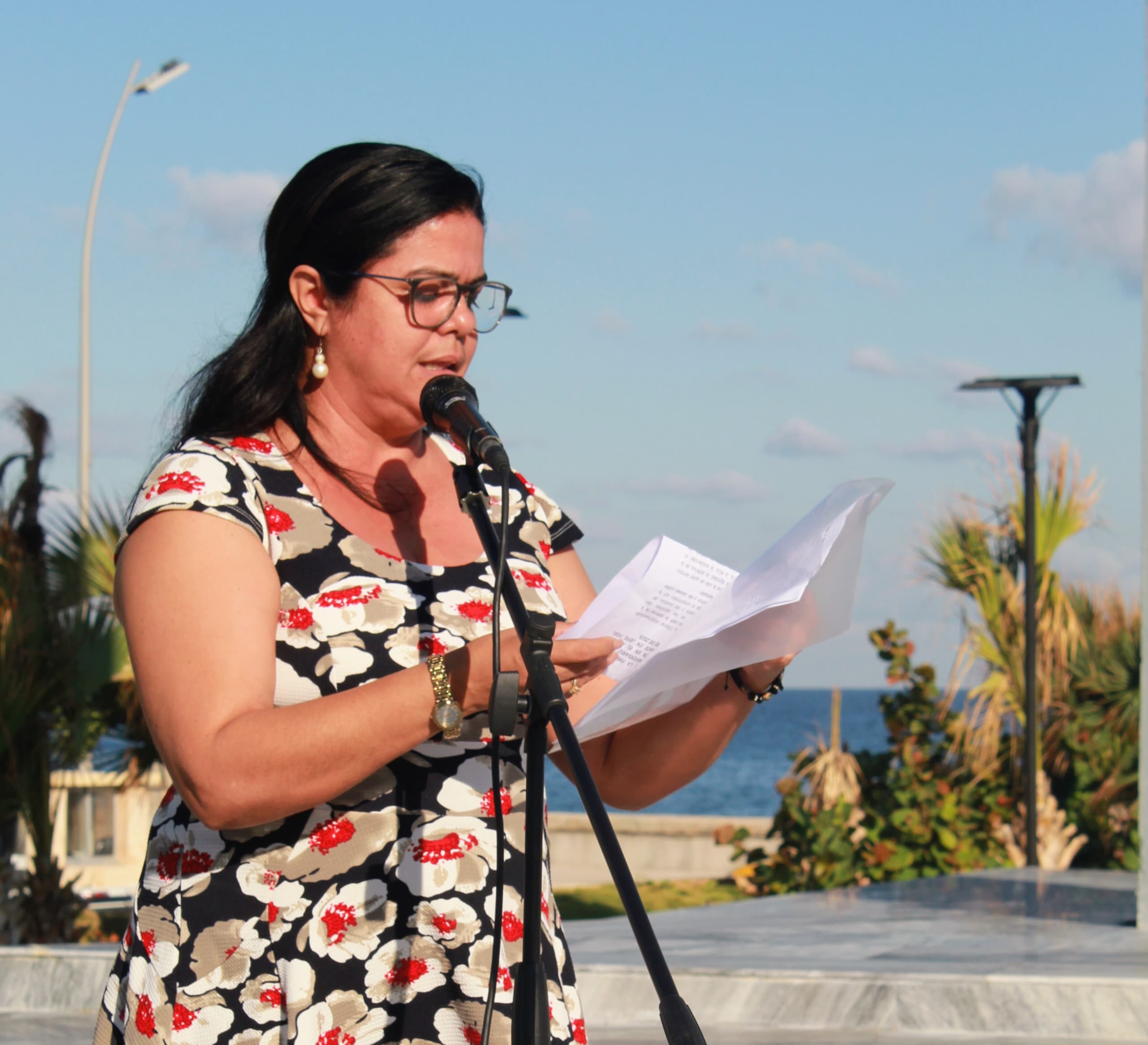 Aimara Guzmán Carrazana, miembro del Buró Provincial del Partido, pronunció las palabras centrales que dieron paso a la entrega de los compromisos por el aniversario 67 del Triunfo de la Revolución.