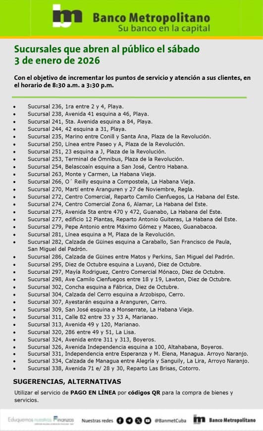 El Banco Metropolitano de La Habana (Banmet) anuncia a sus clientes las entidades que brindarán servicio este sábado 3 de enero de 2026