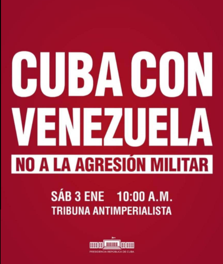 En rechazo a la agresión militar imperialista yanqui contra la República Bolivariana de Venezuela, y como respaldo a su legítimo presidente Nicolás Maduro Moros y la Fusión Popular, Militar y Policial, el Gobierno Revolucionario convoca al pueblo de La Habana, en representación de toda Cuba, a un acto de condena, a las 10.00 am, en la Tribuna Antimperialista José Martí.