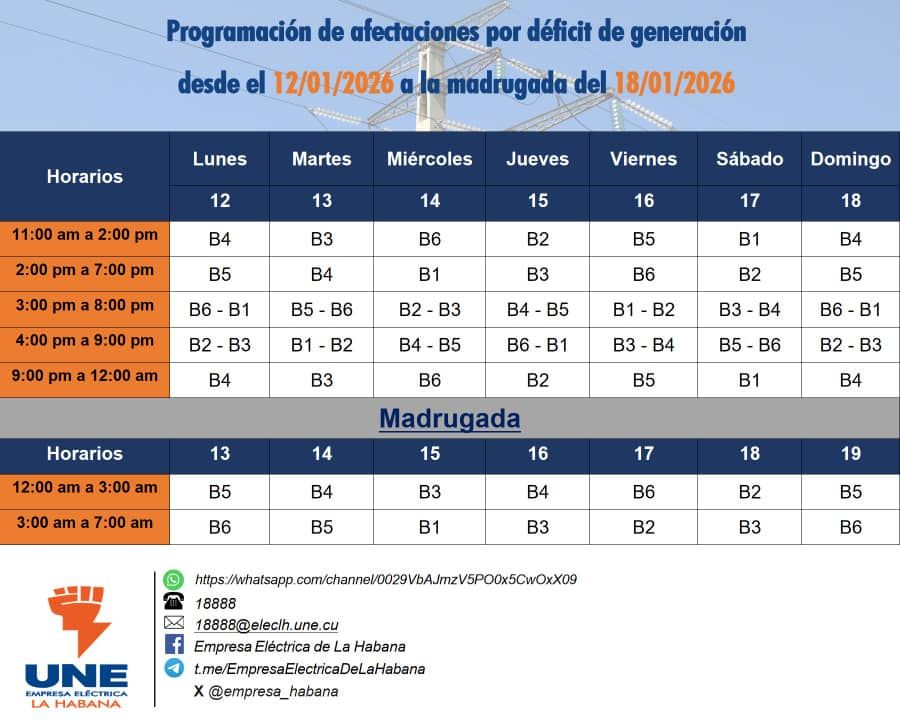 A través de sus perfiles institucionales en las distintas redes sociales digitales, la Empresa Eléctrica de La Habana (EELH) informa a sus clientes la siguiente planificación de afectaciones al servicio en la semana del 12 al 18 de enero de 2026: