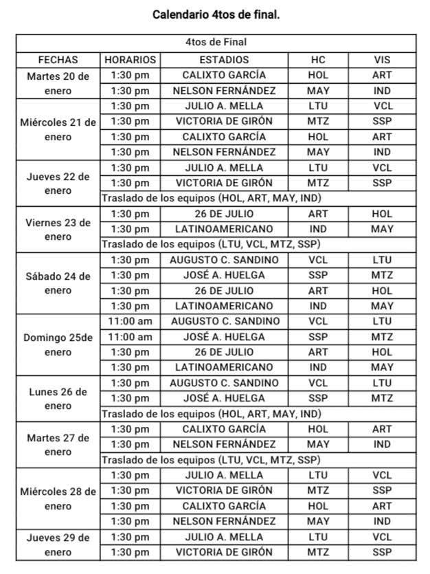 A continuación publicamos el calendario de los Play off de la presente Serie Nacional de Béisbol: