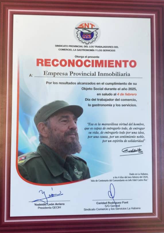 En el marco de la jornada por el Día del Trabajador del Comercio y la Gastronomía, el Sindicato Provincial del sector entregó este miércoles un reconocimiento a la Empresa Inmobiliaria del Comercio de La Habana (EICIH), por los resultados alcanzados durante el año 2025.