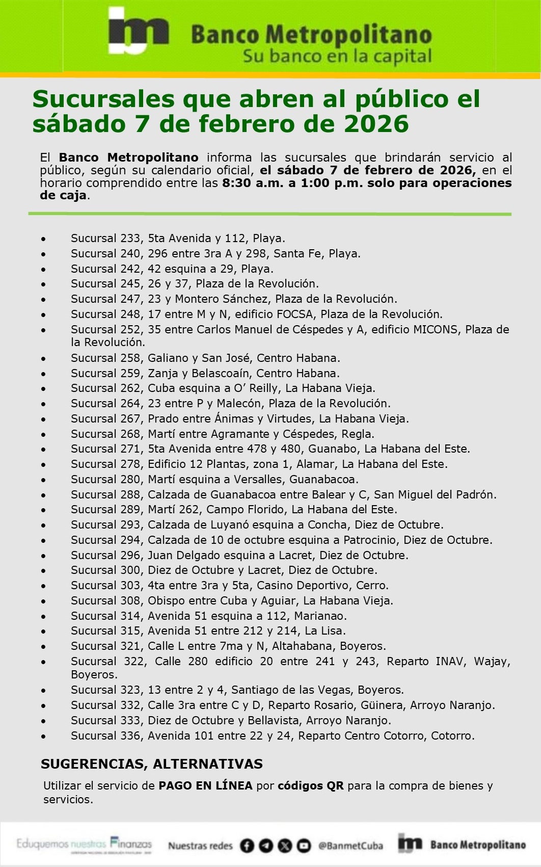 El Banco Metropolitano de La Habana (Banmet) anuncia a sus clientes las entidades que brindarán servicio este sábado 7 de febrero de 2026 :