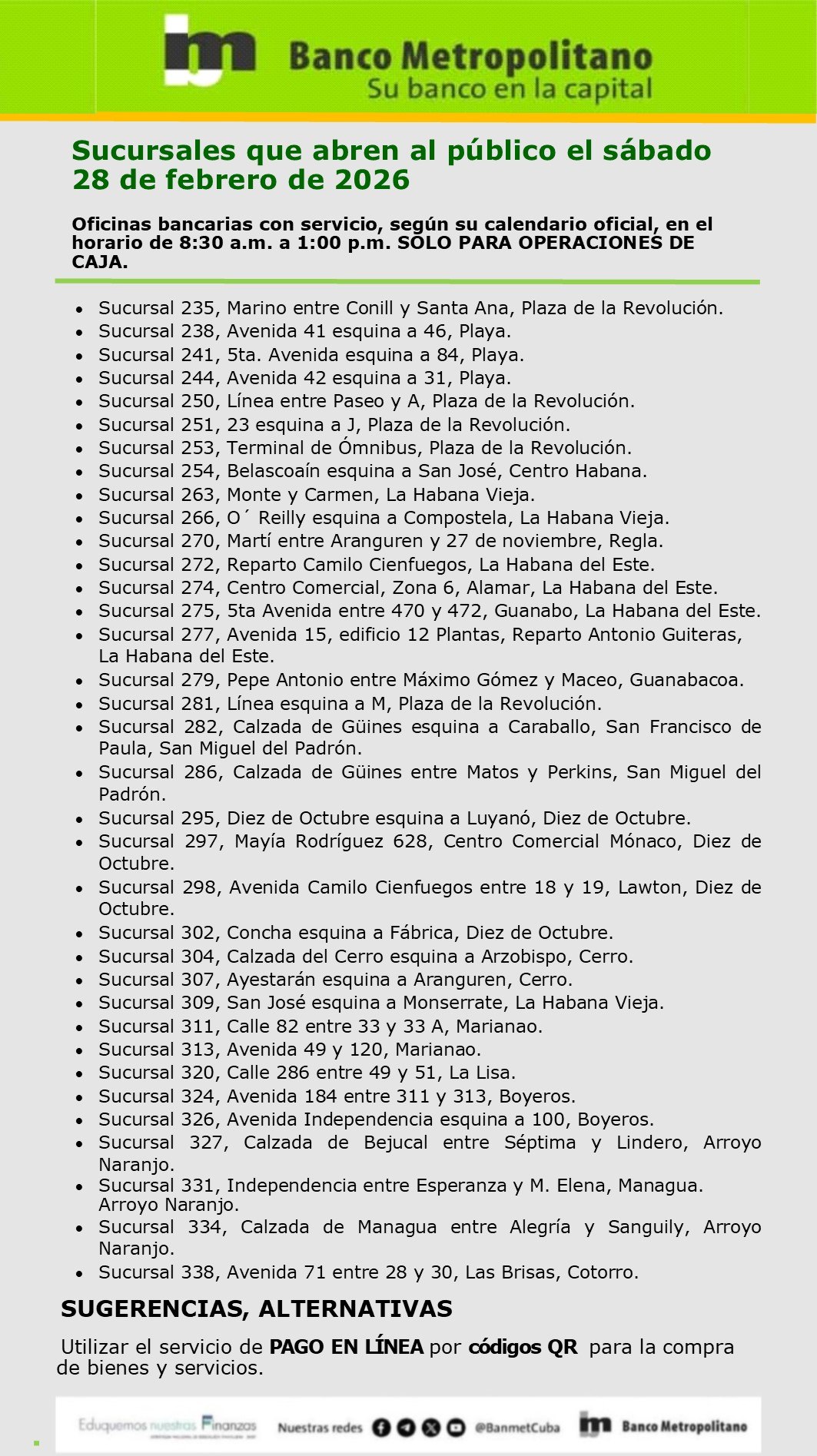 El Banco Metropolitano de La Habana (Banmet) anuncia a sus clientes las entidades que brindarán servicio este sábado 28 de febrero de 2026:
