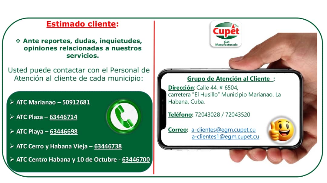 Empresa de Gas Manufacturado facilita contactos de Atención al Cliente en cada municipio