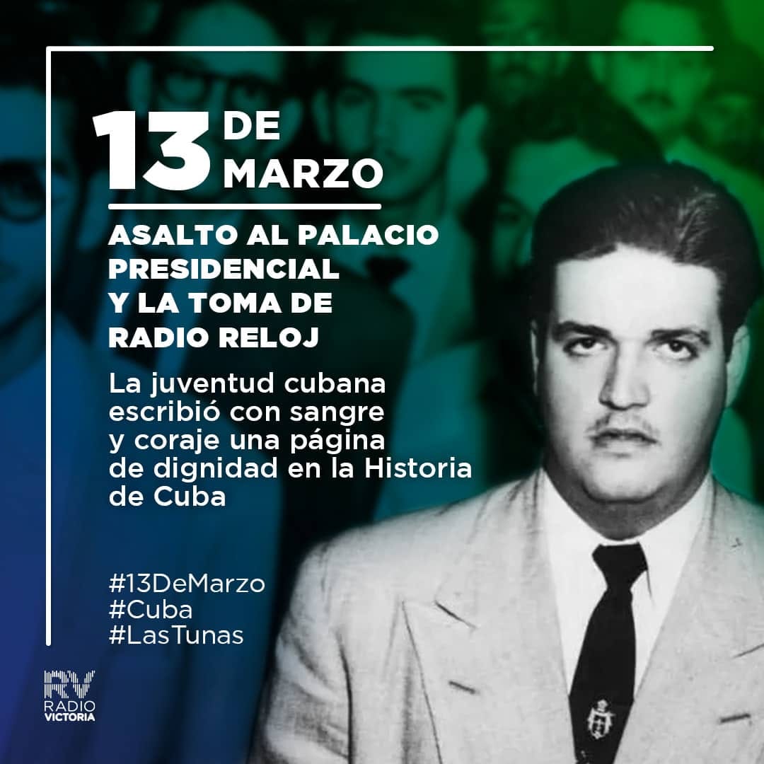 Cada 13 de marzo, a partir de las 3.00 pm, toda Cuba se apega a ese hecho de extraordinaria audacia y valor; y en escuelas, fábricas, talleres, en los recintos universitarios y las 100 emisoras del país, se apegan a Radio Reloj, hoy el Canal de Información continua más antiguo del mundo, para escuchar, de nuevo la voz de José Antonio Echeverría, llamando al pueblo cubano a derrocar la tiranía y darle una nueva clarinada de acción y de combate a la Patria que contempla orgullosa.