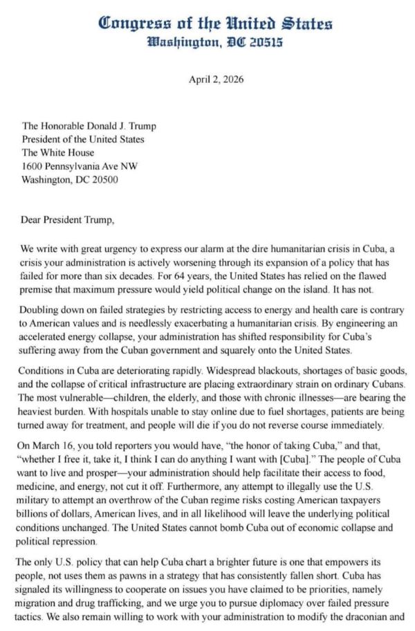 La Carta menciona el "rápido deterioro de las condiciones de vida", los apagones prolongados, el corte de suministros básicos y cómo eso afecta a los más vulnerables. Igualmente señala que nuestra nación es un aliado en temas como el combate al tráfico humano y al narcotráfico, y que sólo Estados Unidos puede solucionar los problemas de Cuba, con la eliminación de las restricciones.