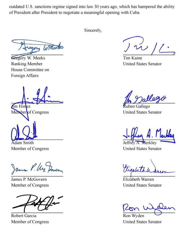 Entre ellos hay senadores, miembros del Congreso, así como altos funcionarios del Comité de Relaciones Exteriores del Senado estadounidense. La misiva evoca el daño que sufre la población cubana debido a las "fallidas políticas' implementadas desde hace 64 años.